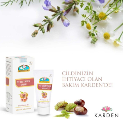 Karden At Kestanesi Kremi Nasıl Yapılır Karden kremleri, Ankara’da bulunan üretim tesisimizde sizler için su buharı distilasyon yöntemi ve soğuk pres yöntemi ile elde edilen ürünlerin karıştırılmasıyla üretilmektedir. Uyarı: Çocukların ulaşamayacağı yerde ve güneş ışığına direkt maruz bırakmadan saklayınız. Tavsiye edilen tüketim tarihi (T.E.T.T.) ve parti no (P.N) ambalaj üzerindedir. Tüketim tarihi geçmiş, hasarlı ve kırık ürünlerden lütfen uzak durunuz. İlaç değildir.  Hamilelik ve emzirme dönemi ile hastalık veya ilaç kullanılması durumunda doktorunuza danışınız.
